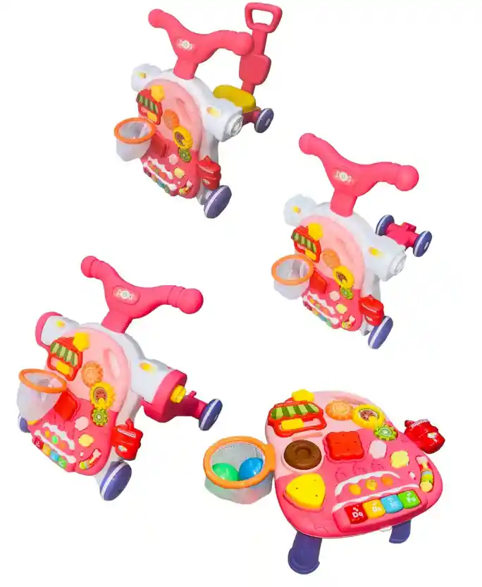 ANDADERA 4 EN 1 CON SCOOTER, CARRO Y MESA DE ACTIVIDADES Este versátil juguete es perfecto para el desarrollo de tu pequeño desde los 6 hasta los 36 meses. Ofrece tres funciones en uno: andadera, scooter, modo montable y mesa didáctica, brindando una experiencia de juego completa y educativa. - CARACTERÍSTICAS: -- Tres Funciones en Uno: -- Andadera: Ideal para ayudar a los bebés a dar sus primeros pasos y mejorar su coordinación. -- Modo Scooter: Perfecto para que los niños desarrollen habilidades motoras y equilibrio mientras se deslizan. -- Modo Montable: Ofrece diversión mientras se monta, promoviendo el desarrollo muscular y la estabilidad. -- Mesa Didáctica: Incluye luz y música, pandereta, agujero para tirar bolas y bloques didácticos para estimular el aprendizaje y la creatividad. -- Desarrollo Integral: -- Reconocimiento de Colores: Los bloques didácticos ayudan a aprender y distinguir colores. -- Desarrollo Muscular y Auditivo: La música alegre y sonidos naturales estimulan el desarrollo auditivo y motor. -- Desarrollo Táctil: Las formas y texturas variadas fomentan la estimulación táctil. -- Capacidad de Memorización y Creatividad: Las actividades interactivas promueven la memoria y la creatividad. -- Diseño Adaptado: -- Caja de Música: Desde los 9 meses, los bebés pueden tocar la caja de música, entrenando la capacidad de agarre y flexibilidad de las manos.