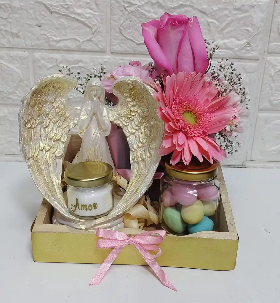 hermoso angel con vela aromatizante y mensaje ,almendras en frasquito y arreglo floral con rosa ,claveles y gerbera