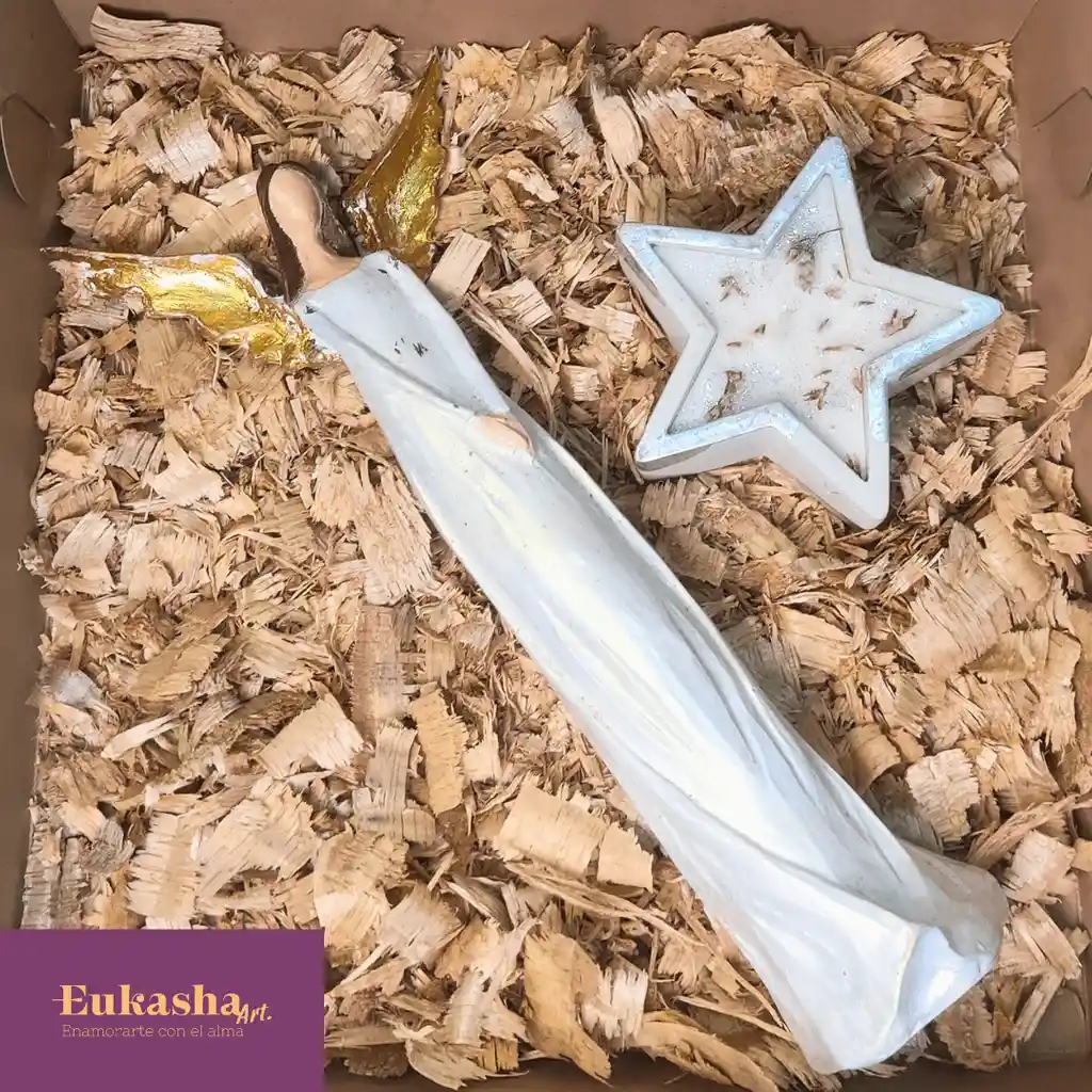 Ángel en marmolina morado, 15cm apróx., vela aromática en recipiente de concreto. Disponible en morado animal print