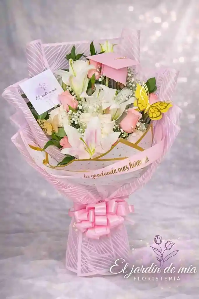 ramillete con lirios, rosas, gipso, mariposas, papel coreano moño y tarjeta