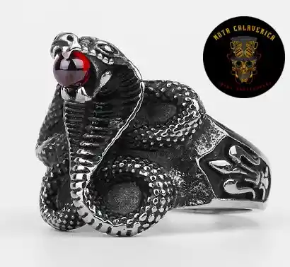 Anillo diseño cobra con perla roja en colmillos, efecto plata envejecida, 100% acero hipoalergénico e inoxidable