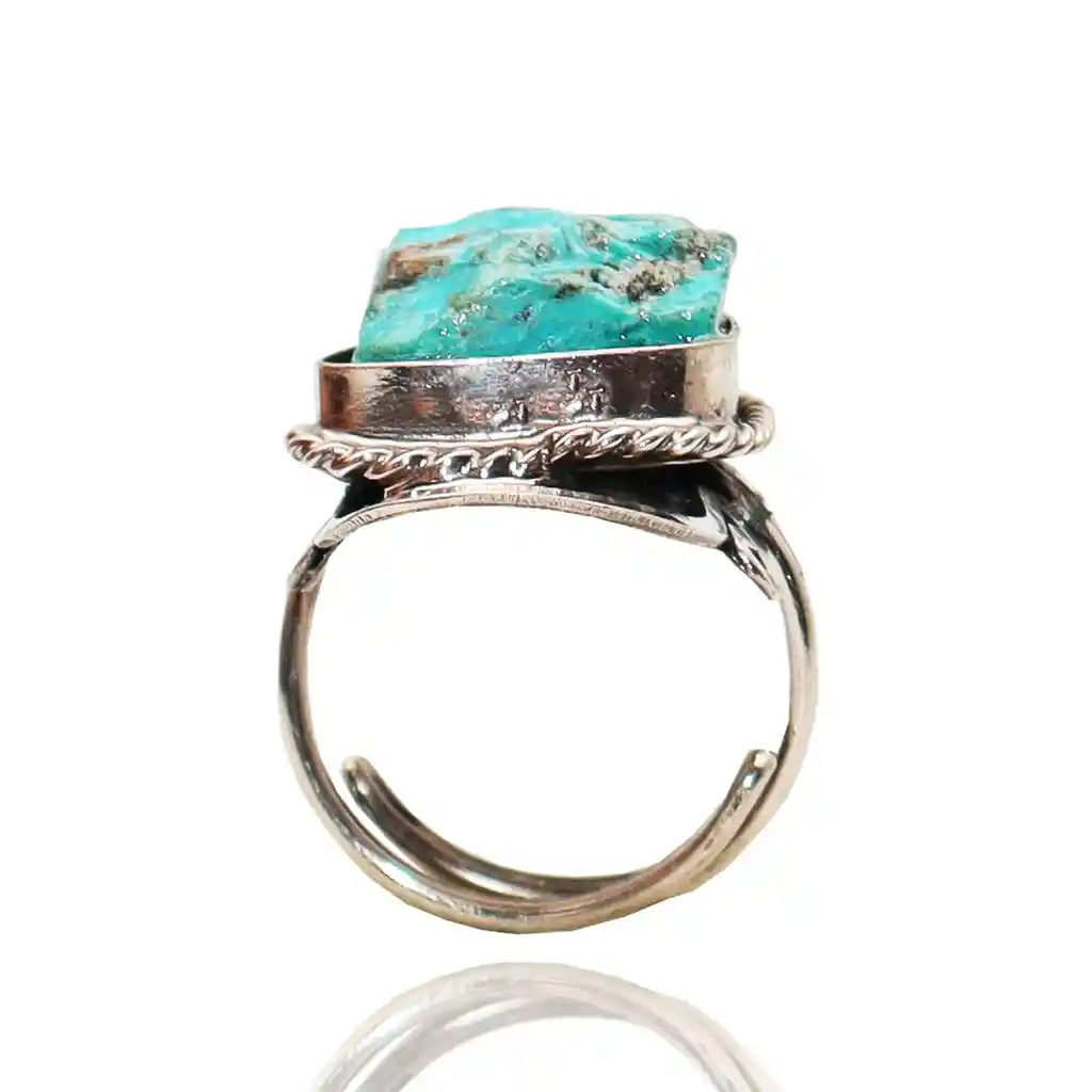 Lindo anillo acompañado de un cuarzo turquesa en bruto, considerada una piedra sanadora muy eficaz que ofrece bienestar al cuerpo y espíritu. Fomenta la sintonía espiritual y potencia la comunicación con los mundos físico y espiritual. Nota: la piedra puede variar en forma, tamaño y color ya que es piedra natural en bruto es decir no ha sido tallada. /// El anillo incluye estuche + Paño para limpiar el anillo /// El anillo se puede limpiar facilmente y retornar a su color plateado original. ((((((( NOTA: EL VALOR DE LA PUBLICACIÓN CORRESPONDE A UN SOLO ANILLO ))))))))) Ficha técnica: Material: Alpaca de Calidad - Cuarzo Turquesa en Bruto Dimensiones de la piedra : 2 cm aprox x 1.5 cm aprox Tipo de Anillo : Ajustable Genero : Unisex Términos de garantía: Para defectos de fábrica o retractos: Por favor revise el producto apenas lo reciba y antes de usarlo. No aplican ley de retracto o defectos de fábrica luego de usar el producto. Se manejan máximo 5 días para reportar defectos de fábrica (por ejemplo, producto funciona mal, piezas faltantes, rotas, etc). Para hacer efectiva la devolución el producto debe devolverse con el empaque original, el cual debe estar en buen estado, incluir todos los documentos y las partes completas y sin daños. Los cuidados y recomendaciones para mantener un producto en buen estado y evitar que el color negro se caiga rápidamente son los siguientes: No aplicarle perfumes ni cremas directamente, no mojarlos, no dejarlos caer y procurar limpiarlos para retirar suciedad.