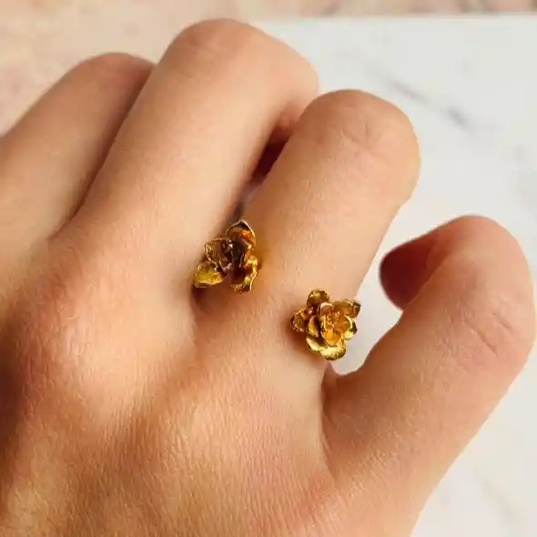 Este anillo reúne dos mini suculentas reales sobre una ramita natural, capturadas en su forma original mediante la técnica de fundición orgánica. Las suculentas, con su encanto tierno y compacto, se entrelazan delicadamente, creando una composición botánica que parece crecer sobre tu piel. Hecho a mano en Colombia, este anillo celebra lo pequeño, lo suave y lo natural, convirtiendo un instante efímero de la naturaleza en una joya duradera y poética. Características técnicas: • Plantas utilizadas: dos mini suculentas y una ramita natural • Técnica: fundición orgánica • Material: bronce con baño en oro de 24k • Hecho a mano en Colombia