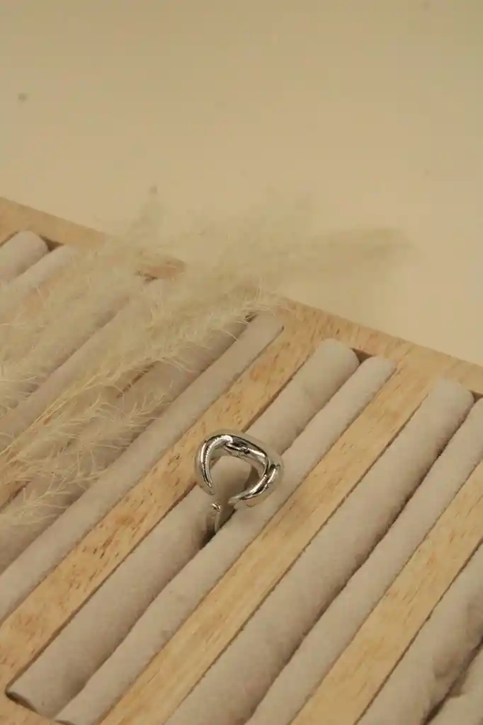 Anillo de rodio plateado en forma de luna, ideal para complementar cualquier look, con acabado brillante y alta durabilidad.