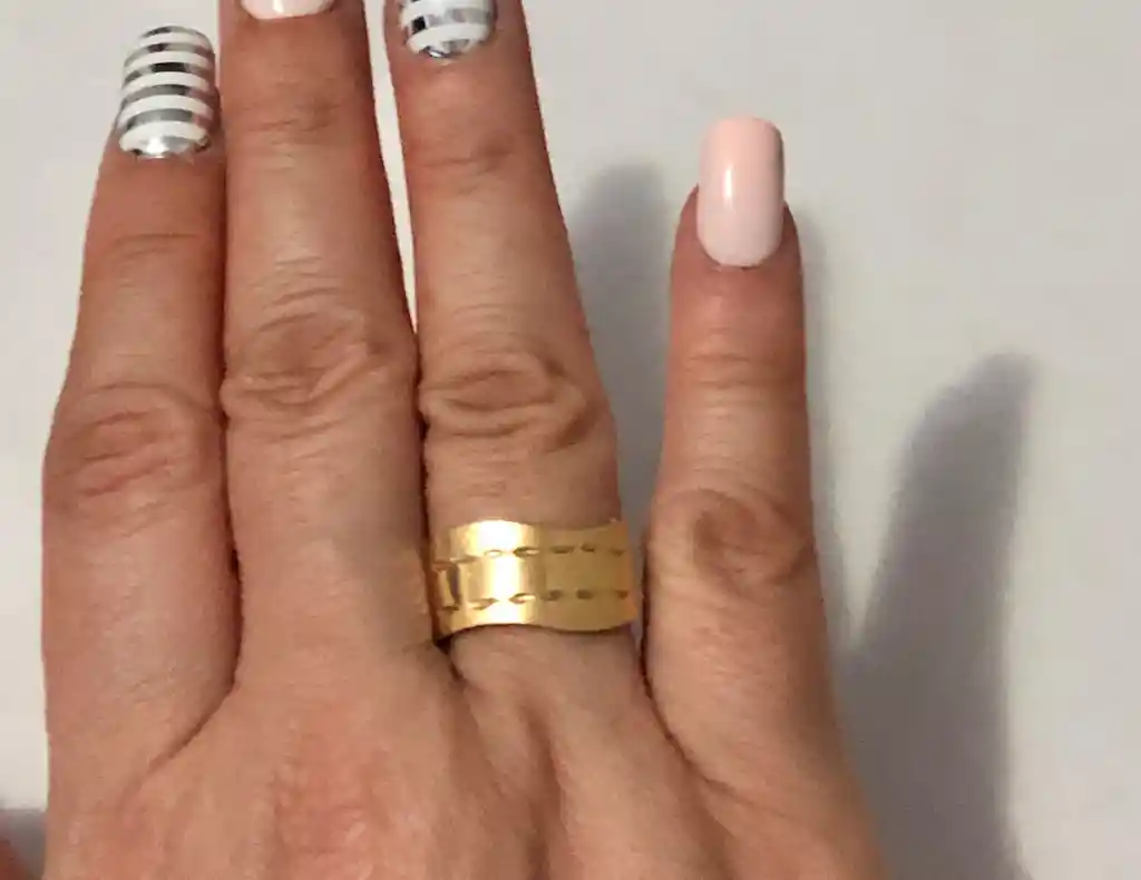 Anillo Grabado Olas Diseño Exclusivo en Herraje Goldfilled 1420 TALLA 6 El GoldFilled 1420 Se fabrica combinando capas de aleación de oro de 14 kt con un metal base - generalmente de latón. Tiene un enchape 50 veces más gruesa que el baño galvanoplastia en oro normal. Mediante la combinación de capas de aleación de oro sobre un metal de base (por lo general de latón) se enrollan con el grosor y forma deseados. Los Herrajes son conocidos por su durabilidad y puede ser usada sin reacciones ni dificultades en la mayoria de personas