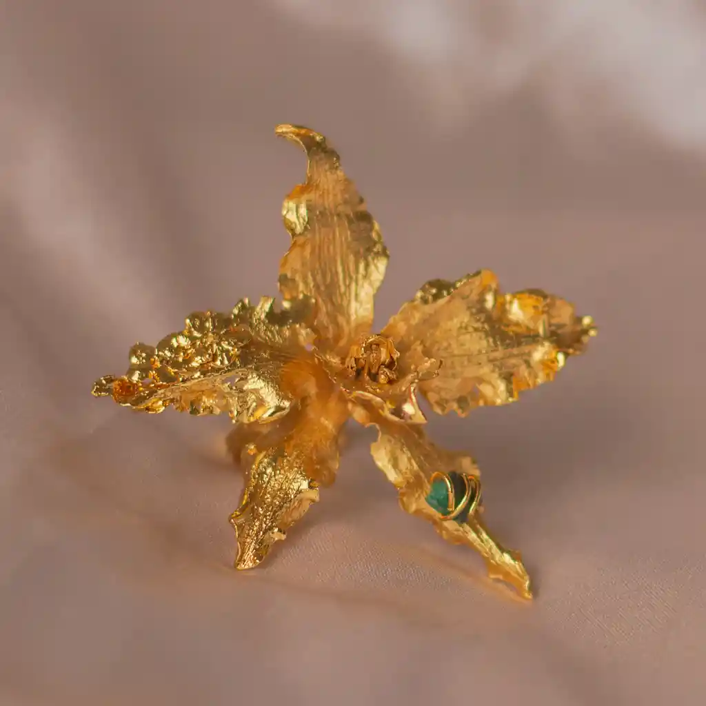 Lleva contigo un pedazo de la naturaleza con nuestro Anillo Orquídea Odontoglossum Esmeralda. Cada orquídea, cuidadosamente seleccionada y transformada en una obra de arte única, es inmortalizada en bronce y realzada con un baño en oro de 24 kilates y esmeraldas preciosas. Este anillo no es solo una joya, es un recordatorio diario de la belleza interior y la fuerza femenina. Representa el equilibrio y la gracia, ofreciendo a quien lo lleva una conexión íntima con la serenidad y la elegancia de la naturaleza. Nota: Cada anillo es único y puede variar en forma y tamaño debido a su origen natural. Material: Objeto natural inmortalizado en bronce y enchapado en oro de 24 kilates - Morralla de Esmeralda Colombiana, En Liz de la Cruz transformamos los regalos de la naturaleza en joyas únicas, como tu.