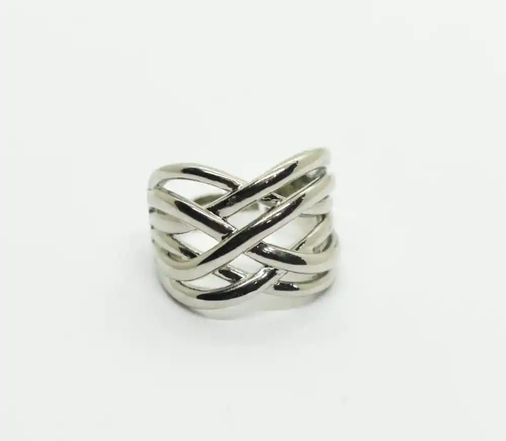 HERMOSO ANILLO GRUESO PLATEADO EN FORMA DE TRENZA, INDICADO PARA COMPLETAR TU OUTFIT, LUCIR HERMOSA Y ÚNICA