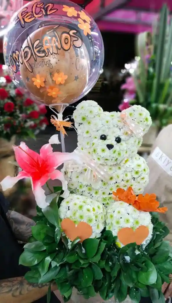 Arreglo en forma de oso con pinoquio, lirios, moño, figuras en fomi, globo burbuja personalizado y en base de madera.