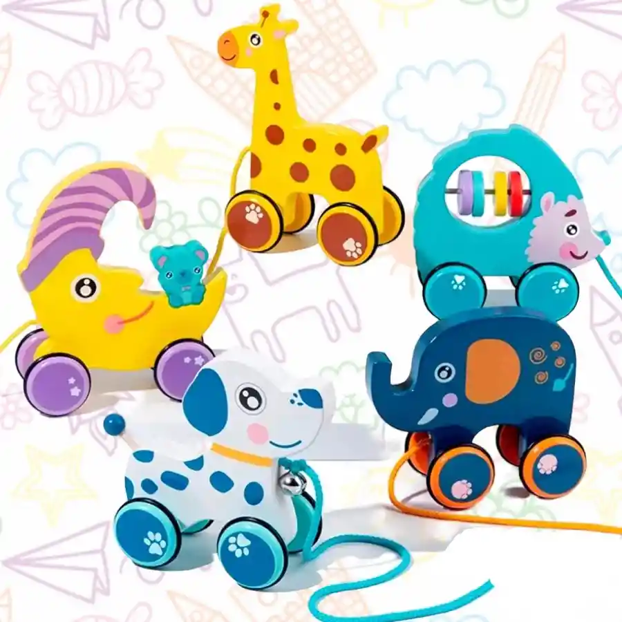 Animales de dibujos animados de madera para niños, Educación Temprana cuerda de tracción manual. Material: Madera Medidas: 14,8 x 16,3 CM Guía de aprendizaje para escalar y ejercicio para caminar. Suba y camine con el lindo auto y sea testigo del feliz crecimiento de su bebé. Bonito diseño con forma de animal. La rueda de madera está envuelta con un anillo de goma para mejorar la absorción de impactos y reducir el ruido.