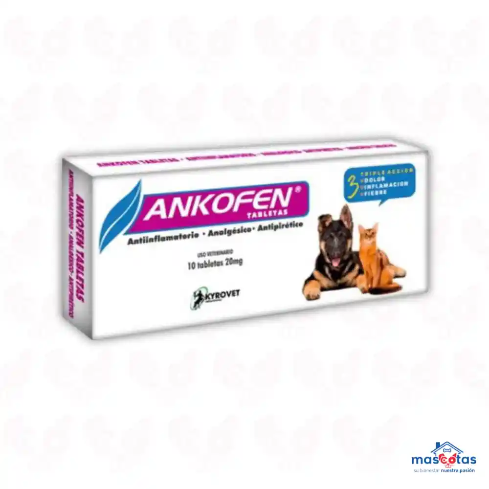 Antiinflamatorio, analgésico, antipirético no esteroide para perros y gatos. Para el tratamiento de procesos inflamatorios de origen no infeccioso de los sistemas osteoarticular y musculo esquelético. Como coadyuvante en procesos postquirúrgicos de los sistemas osteoarticular y musculoesqueletico. Ankofen es ideal para aliviar el dolor y reducir la inflamación en trastornos como artrosis, traumatismos y esguinces, además de ser un coadyuvante eficaz en la recuperación postquirúrgica. Proporciona alivio rápido del dolor Reduce eficazmente la inflamación en perros y gatos Ayuda en el manejo de condiciones como artrosis y traumatismos Facilita la recuperación en procesos postquirúrgicos Adaptado para uso en todas las etapas de la vida del animal Composicion Cada tableta contiene 20 mg de Ketoprofeno, acompañado de excipientes c.s.p. para completar una tableta. Ingredientes Cada tableta contiene ketoprofen 20 mg, excipientes c.s.p. 1 tableta. Dosis Administra una tableta por cada 20 kg de peso del animal (equivalente a 1 mg de ketoprofeno/kg) cada 24 horas. Intrucciones de uso Para garantizar la seguridad y eficacia del tratamiento, se recomienda seguir las indicaciones del veterinario y ajustar la dosis basándose en el peso exacto de la mascota. Es aconsejable ofrecer el medicamento acompañado de alimento para minimizar posibles efectos gastrointestinales. Monitorea la respuesta al tratamiento y consulta al veterinario ante cualquier reacción adversa.