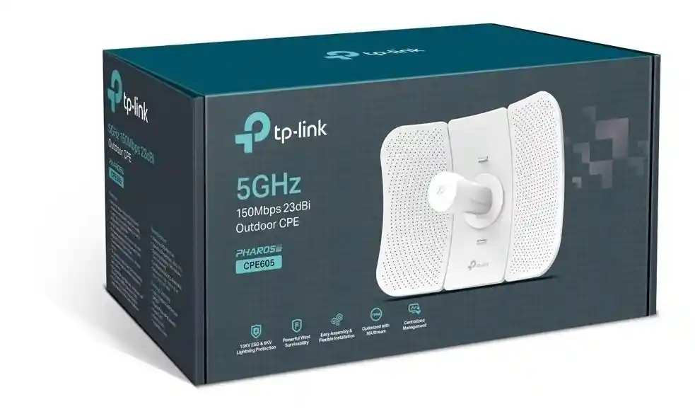 Características principales Marca TP-Link Modelo CPE605 Tipo de antena Direccional Color Blanco Otros Alcance máximo de transmisión 20 m Velocidad máxima de transmisión 150 MB Frecuencia 5 GHz Ganancia 23 dB Largo x Ancho x Altura 2.97 cm x 4.39 cm x 8.58 cm Peso 254 g