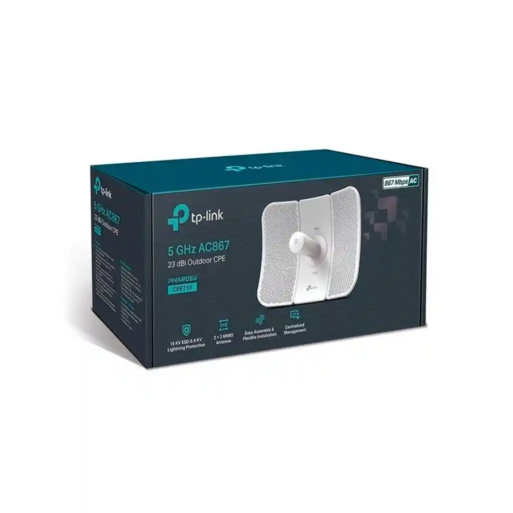 Antena TPLINK 5GHz AC 867Mbps 23dBi CPE para exteriores El TP-Link CPE710 es un punto de acceso exterior diseñado para aplicaciones de red a largo alcance en entornos al aire libre. Este dispositivo opera en la frecuencia de 5 GHz y proporciona velocidades de hasta 867 Mbps. Equipado con una antena direccional de 23 dBi y tecnología 2x2 MIMO de doble polarización, el CPE710 ofrece una excelente calidad de señal y una cobertura mejorada, siendo ideal para redes de largo alcance. Con un diseño robusto, la unidad está preparada para resistir condiciones climáticas adversas, lo que la convierte en una opción confiable para implementaciones en exteriores. Además, la CPE710 facilita la transmisión de señales a distancias de hasta 30 kilómetros, convirtiéndola en una opción eficaz para aplicaciones punto a punto y punto a multipunto. Este dispositivo también es compatible con el software Pharos Control de TP-Link, lo que permite la gestión centralizada de los dispositivos de la red, facilitando el monitoreo y el mantenimiento a distancia. La CPE710 es perfecta para quienes necesitan una solución de red inalámbrica de alto rendimiento y confiabilidad en áreas abiertas o difíciles de cubrir con redes tradicionales.