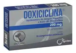 DOXICICLINA Está indicado para el tratamiento de las infecciones de los tractos respiratorio, gastrointestinal, genitourinario, piel y anexos en perros y gatos. Indicado para perros y gatos Antibiótico de amplio espectro Actúa contra bacterias grampositivas y gramnegativas Trata infecciones respiratorias, gastrointestinales, genitourinarias y de la piel También combate la ehrlichiosis canina,
