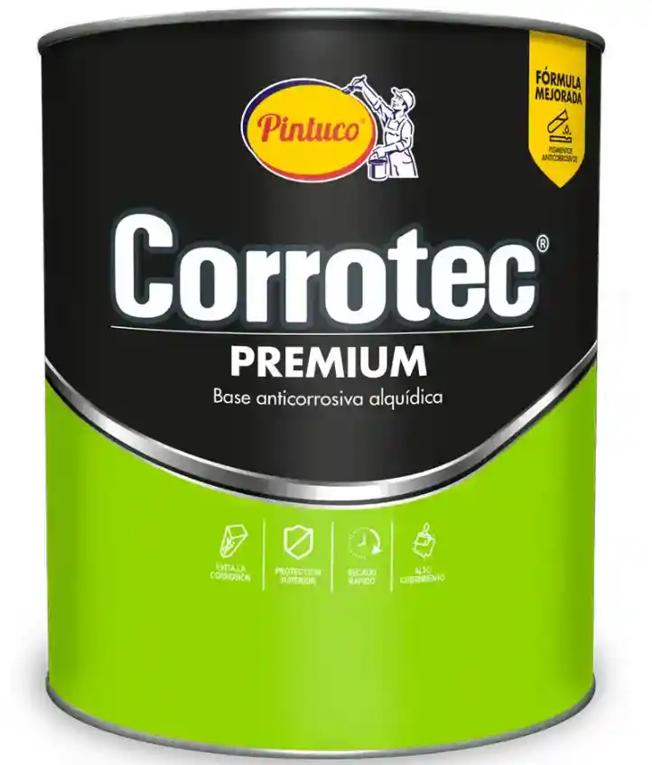 Pintura Corrotec Anticorrosivo Premium es una pintura anticorrosiva base solvente y de acabado mate. Diseñada para mejorar la resistencia y durabilidad de los esmaltes sobre las superficies metálicas ferrosas. Producto formulado con pigmentos anticorrosivos y aditivos inhibidores de la corrosión. No contiene plomo ni cromo.