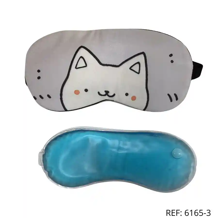 Antifaz gris con dibujo de gatito. Tierno y funcional, incluye gel para aliviar la fatiga ocular.