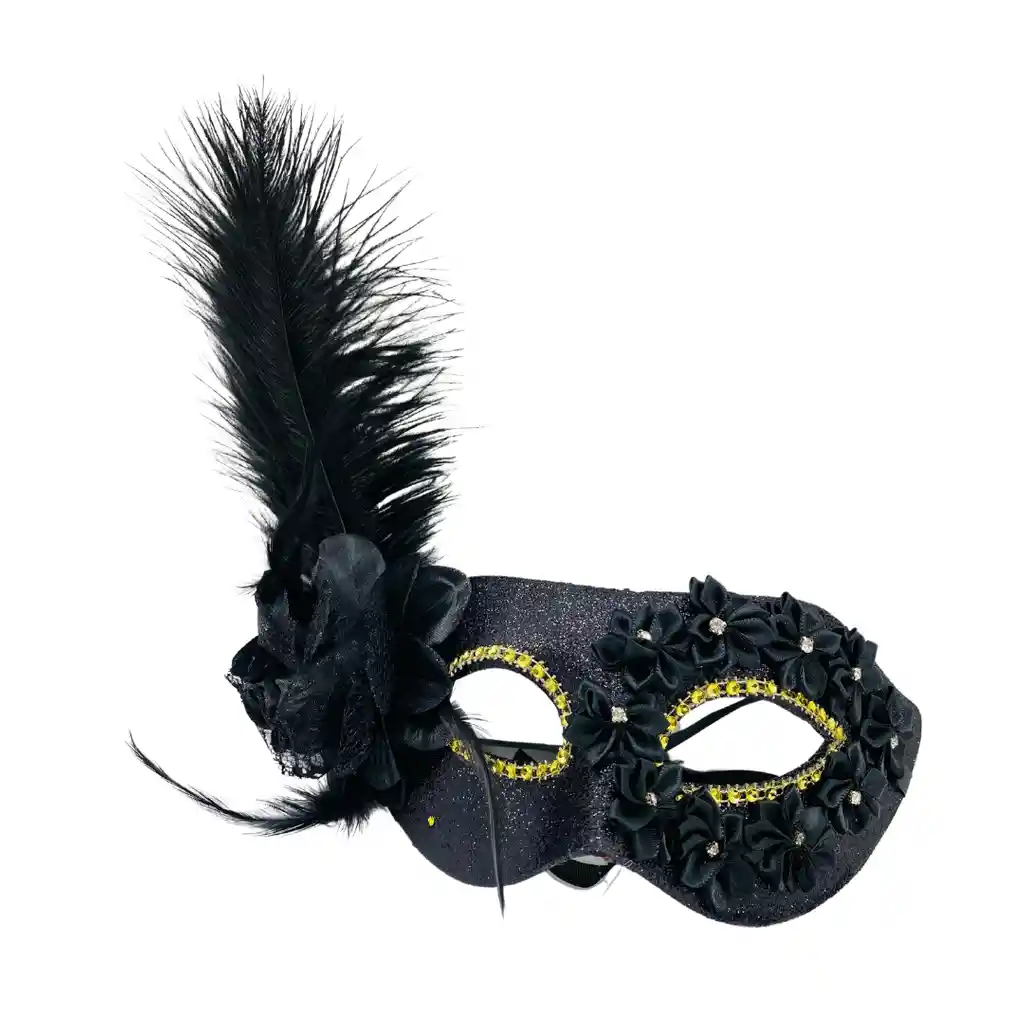 Un accesorio lleno de encanto y estilo. Este antifaz está decorado con flores alrededor de los ojos y una pluma larga en el lateral, creando un look elegante y llamativo. Ideal para fiestas temáticas, Halloween, carnavales o eventos de disfraces.