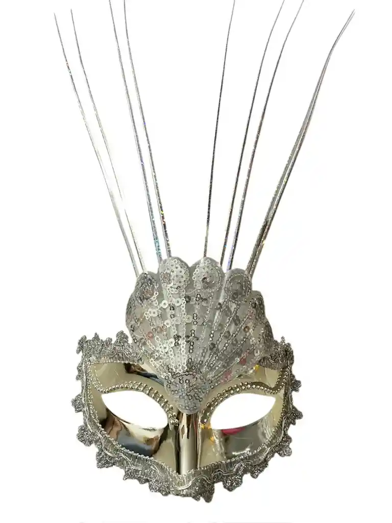 Espectacular Antifaz metalizado fantasia Plateado. Decorado con lentejuelas, perlas plateadas con borde de encaje. El accesorio ideal para destacar en tus actividades, fiestas y celebraciones.