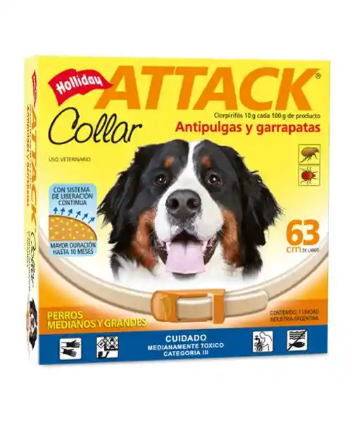 Protege a tu perro de esos molestos intrusos que roban su tranquilidad y pueden comprometer seriamente su salud. El antipulgas Attack Collar es un antiparasitario externo efectivo para el control de pulgas (Ctenocephalides canis y/o felis) y garrapatas (Rhipicephallus sanguineus). Este collar es una solución ideal para que tu perro esté sano y feliz. Útil para la prevención y el tratamiento de infestaciones por pulgas y garrapatas. Dile adiós a esos incómodos y desagradables parásitos. Su fórmula es a base de Clorpirifos 10 %. organofosforado. Contraindicaciones : no se recomienda utilizar el producto en cachorros menores de 4 meses. ni en hembras gestantes o lactantes. mascotas que sufran dermatitis por contacto . o perros enfermos o debilitados. Modo de uso : Ajustar holgado al cuello de manera que pasen 2 dedos . Ajustar el collar a la medida deseada y cortar el sobrante. Retira el collar ante el primer signo de irritación o en caso que se presenten reacciones adversas como temblores musculares. salivación. vomitos y/o diarreas. Collar 63 cm para perros chicos Recuerda medir la circunferencia de la base del cuello de tu mascota con una cinta métrica antes de realizar la compra