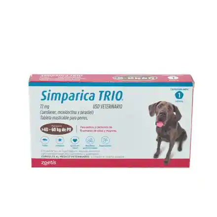 Antiparasitario interno y externo para perros que se administra por via oral una vez al mes y está formulado para el tratamiento y control de infestaciones de pulgas, garrapatas, acaros y parasitos gastrointestinales.