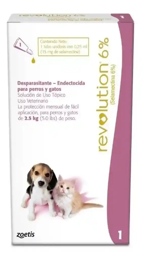 El Antiparasitario Revolution 6% de Zoetis es la solución ideal para mantener a tus mascotas libres de parásitos molestos. Este innovador tratamiento en formato de pipeta es efectivo contra una amplia gama de parásitos, incluyendo pulgas, garrapatas, ácaros y nemátodos, garantizando la salud y bienestar de perros, cachorros, gatos y conejos en un peso de entre 500 g y 2.5 kg. Con su fórmula resistente al agua y su fácil aplicación, Revolution 6% ofrece protección continua durante al menos un mes, asegurando que tus pequeños amigos estén protegidos sin importar sus actividades diarias. Su presentación en pipeta permite una dosificación precisa y ajustable, facilitando el proceso y minimizando el estrés tanto para el dueño como para el animal. Es fundamental actuar contra los parásitos de forma oportuna, y Revolution 6% se convierte en un aliado eficaz en la lucha contra infestaciones. Cuida la salud de tus mascotas con un producto que respeta su bienestar y ofrece tranquilidad a los dueños preocupados por el cuidado de sus compañeros. Garantía del vendedor: 30 días