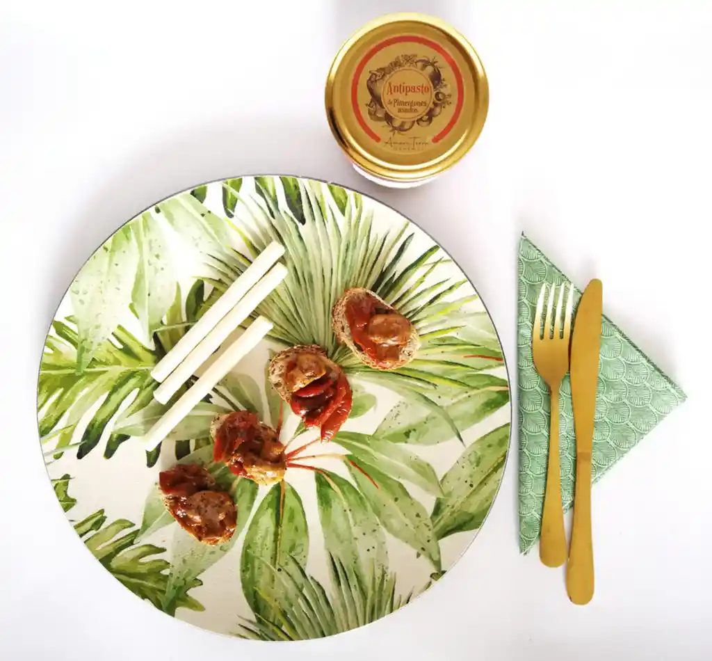 Pimentones asados a fuego lento y encurtidos con champiñones, tomates, cebolla y un toque de ajo. Exquisito antipasto, preparado artesanalmente, con productos de alta calidad, para acompañar cualquier receta que realices. Contiene: pimentones asados, champiñones, tomate deshidratado, ajo, nuez moscada, salsa de soya, sal marina, tomate molido, jengibre y especias. Recomendación: una vez abierto el producto guardarlo en la nevera y consúmelo en el menor tiempo posible. Duración: 1 mes, después de abierto. Modos de uso: acompáñalo con unas galletas de sal, ideal para comer con pan tostado, en tus sándwiches realzara el sabor, acompañalo con tu tabla de quesos preferida.