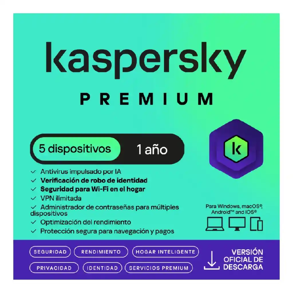 ¿Qué incluye el plan de seguridad de Kaspersky Premium? •Recibes el código de activación más apoyos de instalación •Compatible con Windows, macOS, iOS y Android •Por favor deja tus datos de contacto como celular y correo cuando realices tu compra para una entrega más efectiva Protección completa para tus dispositivos, privacidad en línea e identidad Protege tu vida digital con nuestro plan más avanzado, que incluye el galardonado antivirus, protección de la privacidad y la identidad, mejora del rendimiento y beneficios prémium imprescindibles: • VPN rápida e ilimitada • Administrador de contraseñas y bóveda de seguridad • Soporte de TI remoto Navegación privada e ininterrumpida Herramientas para evitar el seguimiento en línea no autorizado, la aparición de anuncios y el uso de los periféricos. • Detección de software espías. • Navegación privada para evitar que realicen un seguimiento de tus actividades y recopilen tus datos privados. • Protección de cámara web y micrófono que detiene el acceso no autorizado. • Supervisión de wifi doméstica: envía una notificación a tus dispositivos cuando un nuevo dispositivo se une a tu red wifi. Protección de datos personales y de pago Protege tus aplicaciones y operaciones bancarias, además de mantener tus credenciales de acceso seguras y a mano. • Protección de pagos: evita que los hackers puedan interceptar tus datos de tarjeta de crédito y financieros. • Administrador de contraseñas. • Protección contra keyloggers. • Bloqueo de aplicaciones para Android mediante seguridad a prueba de hackers. VPN rápida e ilimitada Libertad y privacidad completas en línea sin perder velocidad. • Protección de datos en las redes wifi públicas. • Ocultar la IP para que nadie pueda rastrear tus dispositivos ni tu ubicación geográfica. • Freno de emergencia: evita que tu dirección IP o tus datos personales queden expuestos si la conexión VPN se cae. • Acceso a contenido global. Limpiador y control de estado de discos duros Soluciones para administrar el espacio de almacenamiento de tu dispositivo, realizar una comprobación del estado del disco duro y evitar la pérdida de los datos. • Limpieza de archivos duplicados y grandes. • Eliminador de aplicaciones no utilizadas. Muestra las aplicaciones que utilizas con menos frecuencia y te permite eliminar las que no necesitas. • Monitoreo del estado del disco duro. • Copia de seguridad y restauración. Rendimiento optimizado Medidas rápidas para aumentar la velocidad de tu dispositivo y hacer que funcione con la rapidez para la que fue diseñado. • Inicio rápido. • Aceleración del PC. Hace que tu computador funcione más rápido al eliminar las entradas no válidas del registro de Windows. • Actualizador de aplicaciones y software. Entretenimiento ininterrumpido Te permite ver películas, jugar o utilizar aplicaciones en pantalla completa sin ninguna interferencia y a la máxima velocidad. • Administrador de la actividad: comprueba qué programas y aplicaciones consumen más datos para que puedas cerrarlos y evitar que el PC se ralentice o se congele. • Ahorro de batería: pospón los análisis de virus y las actualizaciones de las bases de datos cuando tu computador Windows o tu dispositivo Android no están cargados. Antivirus Protección de varios niveles diseñada para evitar y neutralizar los virus y el malware. • Detección instantánea de amenazas. • Navegación web segura: activa alertas de pantalla en tu Mac y PC si intentas visitar sitios considerados peligrosos. • Detector de vínculos maliciosos. Antihacker Herramientas tales como antiphishing y firewall para evitar el acceso no autorizado y el secuestro de tu equipo. • Anti-Ransomware. • Bloqueador de ataques de red. • Protección contra correos electrónicos y sitios web falsos. Eliminación de las amenazas actuales Tecnologías para detectar vulnerabilidades, eliminar virus y reparar tu PC si está infectada. • Solución de problemas de Microsoft Windows. • Recuperación de emergencia. • Análisis de vulnerabilidades en aplicaciones. • Búsqueda de rootkits. Además, tienes Kaspersky Safe Kids de forma gratuita para garantizar la seguridad de sus hijos estén donde estén. • Rastreo GPS: mira la ubicación de tus hijos en un mapa, fija un área segura en la que puedan estar y recibe alertas si se alejan. • Búsqueda segura en YouTube. • Filtros para sitios web: bloquea el contenido para adultos y crea una lista de sitios seguros. • Administración de aplicaciones y tiempo frente a la pantalla. ___________________________________________________ Requisitos de Sistema Equipos de escritorio y portátiles con Windows® (sistema con procesador x86) •1500 MB de espacio libre en el disco duro •Microsoft Windows 11 Home / Pro / Enterprise •Microsoft Windows 10 Home / Pro / Enterprise •Microsoft Windows 8 y 8.1/Pro/Enterprise/8.1 Update •Microsoft Windows 7 Starter/Home Basic/Home Premium/Professional/Ultimate: SP1 o superior •Procesador: 1 GHz o superior •Memoria (RAM): 1 GB (32 bits) o 2 GB (64 bits) •Resolución mínima de pantalla: 1024 x 768 Equipos de escritorio y portátiles Mac •3455 MB de espacio libre en el disco duro •Memoria (RAM): 4 GB •macOS 11 - 13 Tablets y teléfonos con Android •Android 8 – 14 •Resolución mínima de pantalla: 320 x 480 •iPhone y iPad •iOS 15 – 17 en adelante