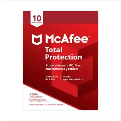 McAfee Total Protection 10 dispositivos 1 año Hemos simplificado la seguridad online para que puedas realizar operaciones bancarias, comprar, navegar y conectarte con confianza hasta en DIEZ (10) de tus dispositivos durante 1 año. Eres libre de vivir tu vida online mientras monitoreamos la Dark Web para todo, desde correos electrónicos hasta números de teléfono. Te proporcionaremos instrucciones fáciles de seguir para proteger tu identidad hasta en DIEZ (10) de tus dispositivo.