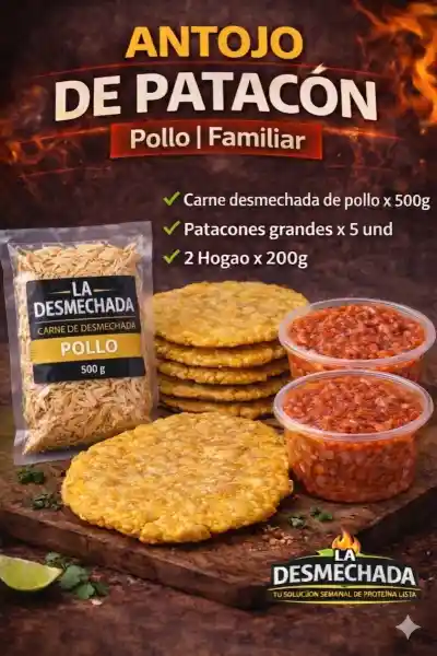 Disfruta nuestro irresistible Combo Antojo de Patacón 🟡🔥 Crujientes patacones acompañados de jugosa carne desmechada de pollo, preparados con ingredientes seleccionados y listos en minutos. Perfecto para compartir o darte un gusto sin complicaciones 😋 Incluye: ✔ Carne desmechada de pollo ✔ Patacones listos para preparar ✔ Hogao casero tradicional 💡 Solo calienta, arma y disfruta en casa.