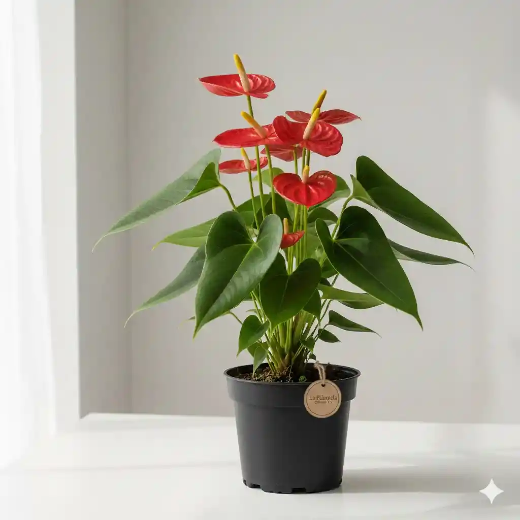 Anturio Rojo Grande El Anturio Rojo Grande es una planta imponente y elegante, reconocida por sus hojas brillantes y sus flores rojas de alta duración. Gracias a su porte amplio y su presencia decorativa, es una opción ideal para quienes desean agregar color, estilo y vitalidad a sus espacios interiores. Sus flores intensas aportan un toque moderno y sofisticado, convirtiéndolo en una pieza perfecta para salas, oficinas y ambientes bien iluminados. Características principales Planta de gran tamaño con follaje abundante Flores rojas brillantes y de larga duración Perfecta para interiores con buena iluminación Ideal para decoración elegante y moderna Excelente opción para regalar por su significado de amor, energía y prosperidad Cuidados Riego: Mantener el sustrato ligeramente húmedo sin encharcar. Regar cuando la capa superior de la tierra esté seca. Luz: Requiere luz indirecta brillante para una floración óptima. Ambiente: Aprecia la humedad ambiental y temperaturas cálidas. Fertilización: Abonar cada 30 días con fertilizante para plantas de flor. Beneficios Aporta presencia y color a cualquier espacio Ayuda a mejorar la calidad del aire Planta resistente y fácil de mantener Ideal para dar un toque de distinción sin requerir cuidados complejos Nota importante: Las plantas pueden variar en forma y tamaño respecto a la foto, ya que cada una es única. Si tu pedido es para regalo, escríbenos por el chat de Rappi: incluimos decoración especial y tarjeta personalizada sin costo adicional.