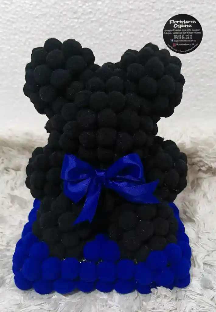 Un diseño exclusivo de la Floristería Ospina que funciona elegancia, misterio y ternura Elaborado con suaves pompones negros en una base azul , decorado con un lazo de satén azul eléctrico . Tiene una presencia elegante y moderna, perfecta para un regalo especial, masculino con estilo romántico y misterioso. Hecho a mano con amor.