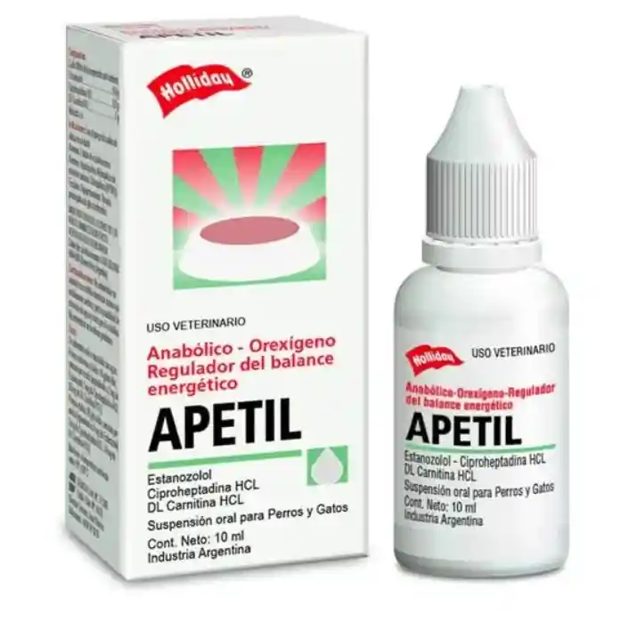 Apetil es una solución oral de uso veterinario diseñada para estimular el apetito y mejorar el balance energético en perros y gatos (anorexia, convalecencia, desnutrición). Contiene ciproheptadina, estanozolol y carnitina, actuando como anabólico y orexígeno.