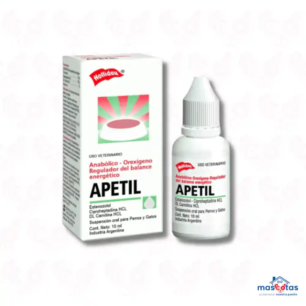 Apetil es una solución oral veterinaria, principalmente para perros y gatos, que actúa como estimulante del apetito (orexígeno) y anabólico. Su fórmula contiene ingredientes como la ciproheptadina, que estimula el centro del hambre, y el estanozolol, que mejora la síntesis de proteínas. También incluye DL-carnitina para favorecer el metabolismo energético. Se utiliza para tratar casos de anorexia, convalecencia, desnutrición y otros problemas de salud que requieren apoyo nutricional. Componentes principales y su función Ciproheptadina: Estimula el centro del apetito en el cerebro y reduce la sensación de saciedad. Estanozolol: Anabólico que ayuda a aumentar la síntesis de proteínas y favorece la recuperación muscular. DL-Carnitina: Facilita el transporte de ácidos grasos para su uso como fuente de energía. Usos comunes Anorexia (falta de apetito) Estados de convalecencia Desnutrición Anemias Trastornos del crecimiento Problemas hepáticos (hepatopatías) Problemas renales sin retención urinaria (nefropatías) Fracturas Hipoproteinemia VENTA BAJO RECOMENDACION MEDICA