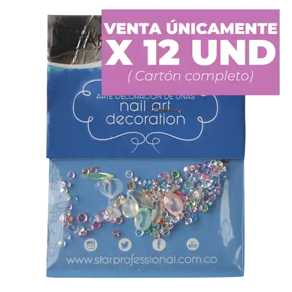 Carton de apliques por 12 unidades para la decoracion de uñas en diversos colores y motivos , perfecto para la decoracion, embellecimiento, y proteccion de las uñas acrilicas, recomendado para profesionales y principiantes en la decoracion de uñas.