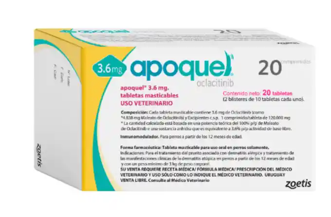 APOQUEL es un medicamento ideal para tratar la dermatitis alérgica en perros. Este producto es para uso interno y debe usarse de acuerdo con las indicaciones médicas del medico veterinario. Este medicamento se puede tomar con el estómago vacío o con alimentos para que se consuma rápidamente. Reduce la piquiña y la inflamación en perros, indicado en perros de 3 a 9 kg.