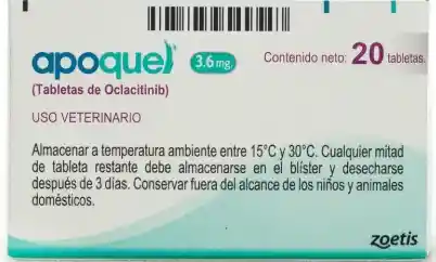 Descripción del producto Apoquel Tabletas Masticables es un medicamento de última generación diseñado para aliviar rápidamente el prurito causado por dermatitis alérgica en perros. Su compuesto principal, Oclacitinib, actúa inhibiendo las señales que provocan picazón e inflamación, ofreciendo un alivio seguro y efectivo en pocas horas. Disminuye la picazón y la inflamación en perros Actúa en las primeras 3 a 4 horas después de la administración Tratamiento seguro a corto y largo plazo Puede ser usado con otros medicamentos comunes Composicion Cada tableta recubierta contiene 3.6 mg de Oclacitinib (como Maleato de Oclacitinib). Dosis Dosis inicial: 0.4 a 0.6 mg de Oclacitinib/kg, administrado dos veces al día durante 14 días. Terapia de mantenimiento: 0.4 a 0.6 mg/kg administrado una vez al día. Intrucciones de uso Administrar por vía oral, con o sin alimento. Se aconseja seguir estrictamente las indicaciones del veterinario y ajustar la dosis según la respuesta del perro al tratamiento. No usar en perros menores de 12 meses o con un peso menor a 3 kg.