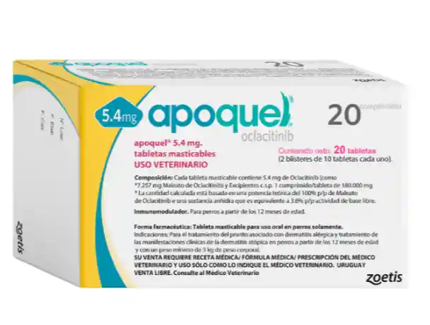 Apoquel 5,4 mg en tabletas masticables es un medicamento veterinario de uso oral indicado para perros, utilizado para el control rápido de la picazón causada por alergias cutáneas como dermatitis alérgica y dermatitis atópica. Ayuda a reducir el rascado, la inflamación y el malestar en la piel, mejorando el confort y la calidad de vida de la mascota. Su principio activo actúa regulando la respuesta alérgica del organismo, brindando alivio efectivo en poco tiempo. Es de fácil administración gracias a su formato masticable y debe utilizarse siempre bajo supervisión veterinaria.