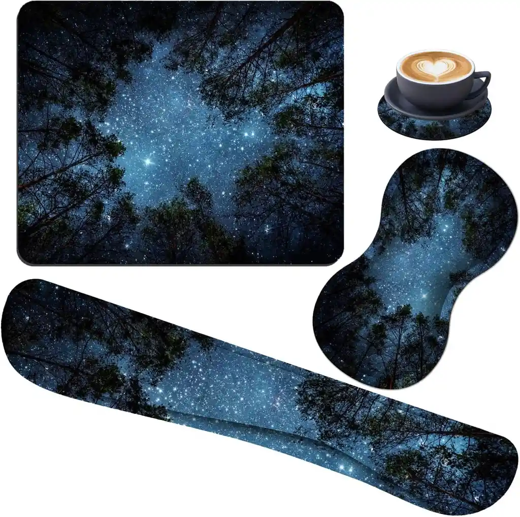 AL0000001765 JUEGO 4 EN 1: Obtendrás un reposamuñecas para teclado, alfombrilla cuadrada para mouse, reposamuñecas y combinación de posavasos, adecuado para la mayoría de computadoras/portátiles, las mejores ideas de regalo. MATERIALES DE ALTA CALIDAD: Los cojines hechos de gel de espuma viscoelástica cómodo y materiales suaves, suaves y transpirables proporcionan un tacto ligero, cómodo, duradero y ergonómico, rebote lento y no se deforma fácilmente, y se utilizan durante mucho tiempo. DISEÑO INFERIOR DE GOMA ANTIDESLIZANTE: La parte posterior del kit de soporte de muñeca utiliza goma natural texturizada para proporcionar un agarre firme y evitar resbalones. Puede disfrutar de un funcionamiento estable del mouse o el teclado durante el trabajo o los juegos. EL MEJOR TAMAÑO: Almohadilla de muñeca de teclado de 17.32 x 3.35 pulgadas almohadilla de muñeca de mouse de 6.8 x 3.7 pulgadas alfombrilla de mouse de 9.4 x 7.9 pulgadas, posavasos de 3.9 x 3.9 pulgadas, mejora la postura de la mano y la muñeca, evita problemas de articulaciones y muñecas y alivia la presión del codo y los hombros del uso prolongado de la computadora. FÁCIL DE LIMPIAR No solo es hermosa, sino también fácil de limpiar. Si quieres limpiar, simplemente límpiala con un paño húmedo y seca al aire. Es muy fácil de mantener limpio.