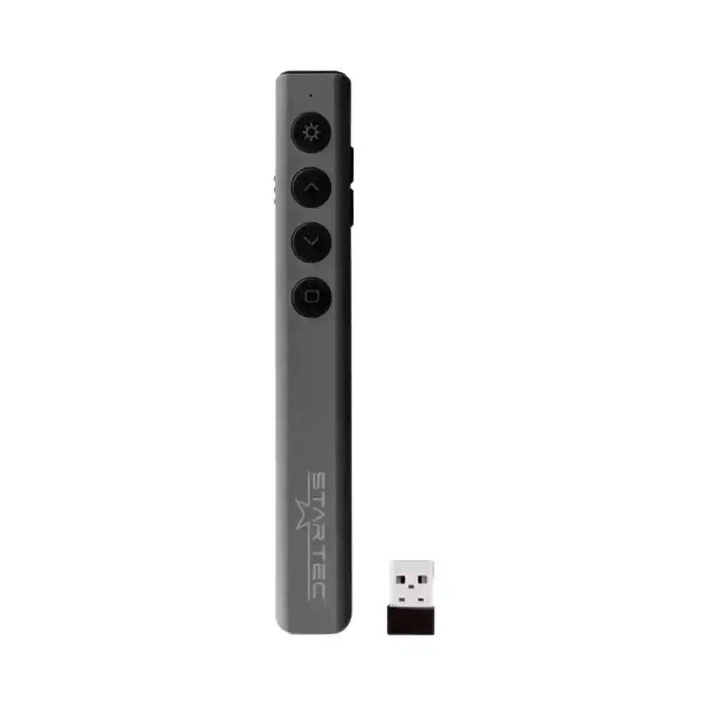 APUNTADOR LASER STAR TEC ST-LP-91 El Apuntador Laser Star Tec ST-LP-91 ofrece control total en presentaciones con su diseño ergonómico y tecnología avanzada. FUNCIONES MULTIFUNCIONALES Incluye botones para cambio de diapositivas, página en blanco, play/pausa y salir, facilitando el manejo de presentaciones. COMPATIBILIDAD UNIVERSAL Compatible con Mac, Linux y Windows, adaptándose a cualquier sistema operativo sin problemas. ALCANCE INALÁMBRICO Operación con frecuencia de 2.4 GHz y un alcance de hasta 30 metros para una presentación sin interrupciones. TECNOLOGÍA PLUG AND PLAY No requiere instalación; conecta el receptor USB y empieza a usarlo de inmediato. DISEÑO ERGONÓMICO Y BAJO CONSUMO Diseñado para una comodidad óptima y con bajo consumo de energía para prolongar la vida útil de la batería AAA.