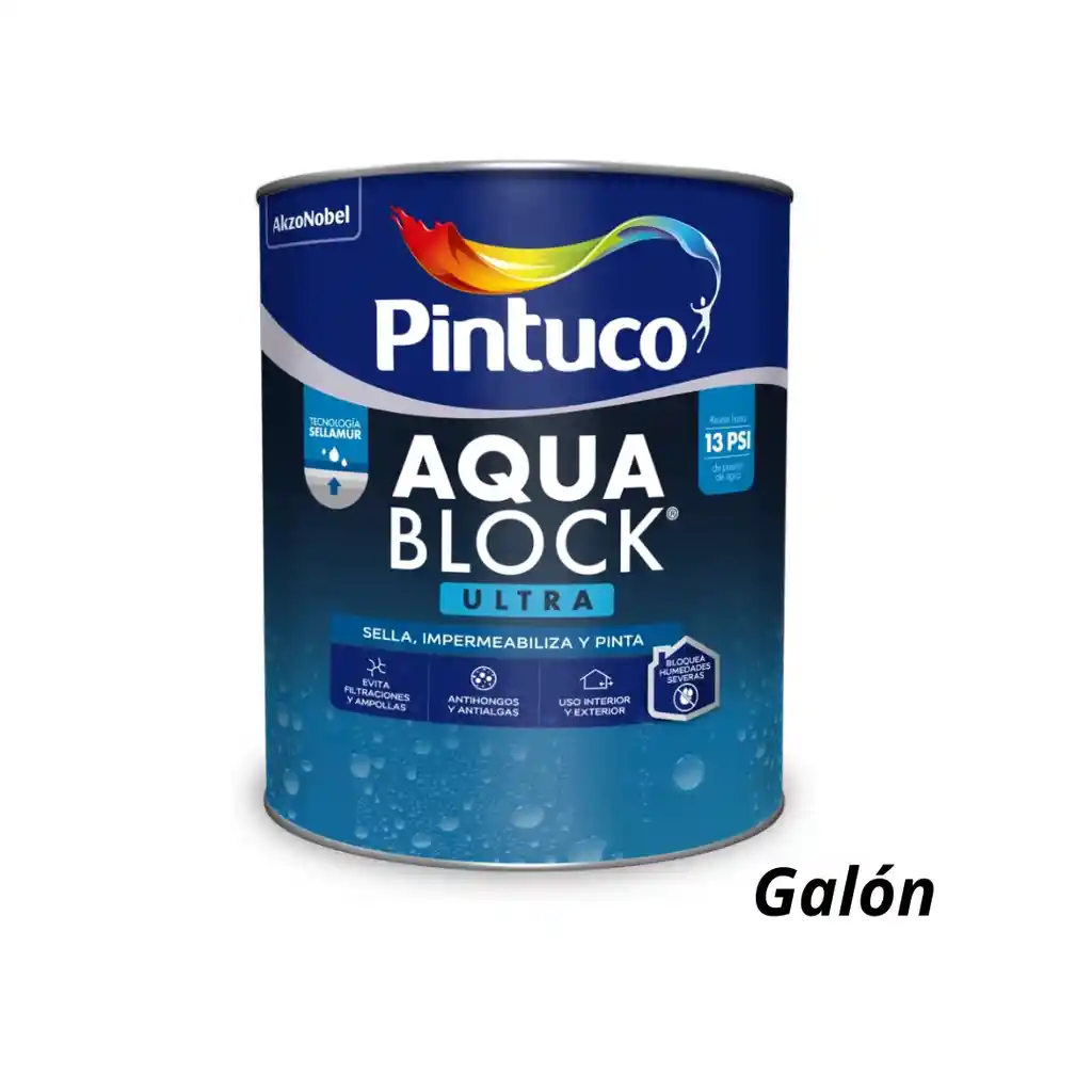 Se usa como tratamiento correctivo y preventivo de humedades severas por nivel freático o presión negativa en muros de contención, sótanos, bodegas, cuartos útiles o viviendas. Presentacion Galon - Descripción general Aquablock Ultra es una pintura impermeabilizante, es acrílica base agua de alto desempeño, para uso interior y exterior, posee resinas acrílicas, fungicidas y micro partículas que penetran el sustrato, lo sellan e inhiben el paso de la humedad por capilaridad o presión negativa. Rendimiento práctico………………………20 m2/gal a 2 manos. Espesor recomendado………………………2 a 3 manos. El rendimiento puede variar dependiendo del método de aplicación y del tipo y estado de la superficie. Estos son algunos de los beneficios que te ofrece Aquablock Ultra: Alta efectividad en la impermeabilización. Acabado liso y satinado. Evita la formación de manchas, moho y hongos. Listo para usar y de fácil aplicación. (No requiere imprimantes). Excelente adherencia y penetración sobre cualquier tipo de superficie porosa. Alta blancura y excelente cubrimiento, permite ser usado como producto de acabado final. Permite ser pintado o estucado; en casos en que se quiera proteger o decorar con otros productos de Pintuco. Resistente a los rayos UV.