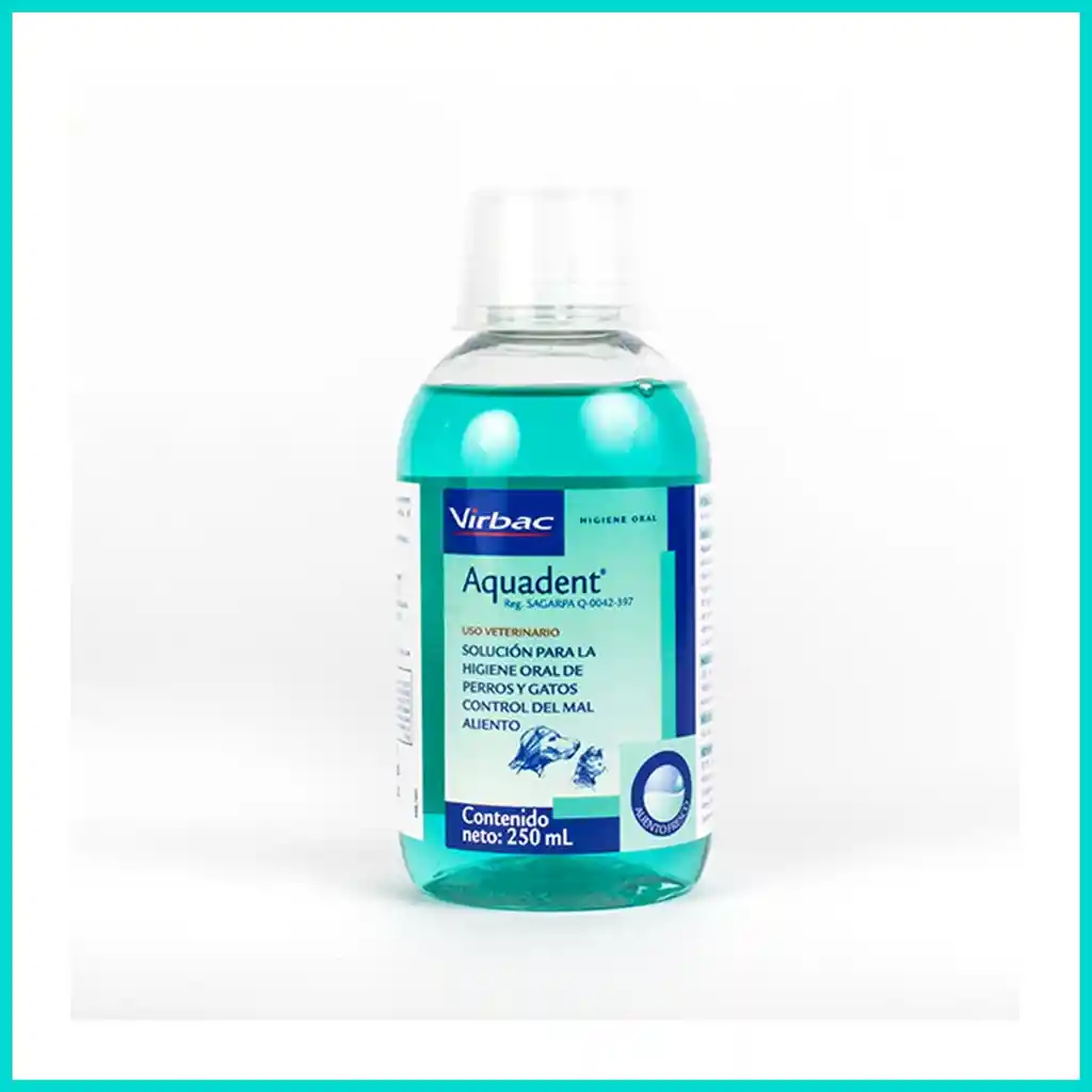 Solución de uso diario para cuidar la higiene oral y dental de perros y gatos Aquadent es una solución de uso diario para cuidar la higiene oral y dental de perros y gatos que ya tienen una dentición adulta. Gracias a su exclusiva formulación, este limpiador bucal es muy eficaz para combatir la formación de placa dental, la halitosis y el sarro, por lo que su aplicación diaria le regalará un aliento sano y fresco a tu mejor amigo. La higiene diaria de la boca es clave para la salud de perros y gatos, por ello es muy importante prevenir los posibles problemas a través de productos como Vetaquadent, que actuará de manera rápida y eficaz sobre la placa dental. En caso de gran acumulación de sarro, hay que realizar una limpieza dental. El veterinario irá eliminando la placa acumulada en la dentadura de tu mascota. Una incorrecta higiene dental puede poner en peligro a tu mascota Desde la aparición de los dientes, la placa dental se va acumulando. Si no se realiza ninguna limpieza bucodental, la placa se mineraliza y se convierte en sarro. Este puede causar una enfermedad grave denominada enfermedad periodontal. Los beneficios de Aquadent Reduce la placa dental en un 50% en apenas 2 meses. Reducción considerable de la formación de sarro. Prevención de enfermedades periodontales. Combate los malos olores bucales. Su uso diario puede ser clave en la prevención de enfermedades renales, hepáticas o cardiacas por la aparición de bacterias. Lleva a tu mascota a tu clínica veterinaria de confianza al menos una vez al año para someterla a un examen dental, ya que el control rutinario mejora la salud dental de perros y gatos, contribuyendo a prevenir enfermedades orales. Dosis y modo de aplicación Agite el producto antes de usar. Diluya 5 mL de Aquadent® en 500 mL de agua. Administrar la solución como agua de bebida. Cambiar la solución cada 24 horas, aunque no haya sido consumida totalmente por el animal.