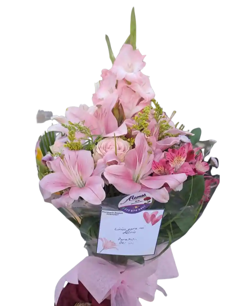 Gladiolos rosados, lirios rosados, rosas rosadas y alstroemeria fucsia que enciende el conjunto con delicadeza. Un bouquet que no necesita discursos, su sola presencia lo dice todo (incluye tarjeta personalizada.)