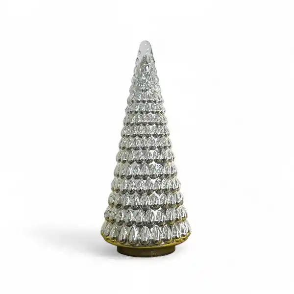 Figura decorativa en forma de árbol de Navidad con un diseño segmentado en capas de color plateado. La superficie tiene un acabado dorado brillante.