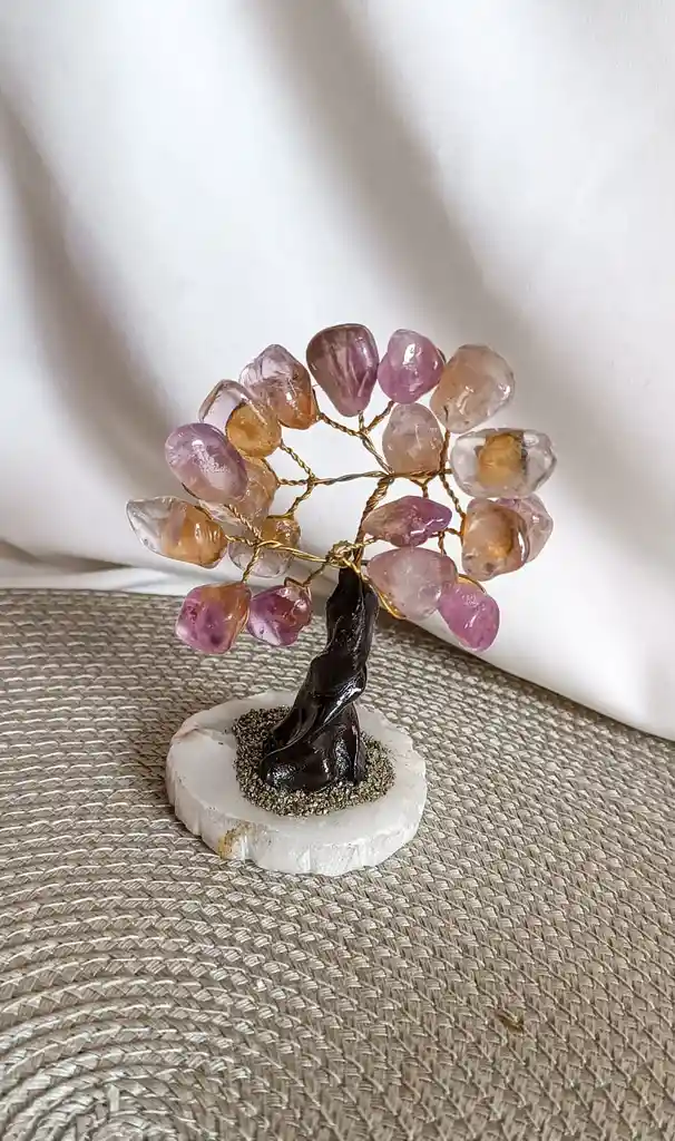 El Árbol de la Vida con Cuarzo Amatista es una pieza artesanal que irradia elegancia y energía positiva, fusionando la belleza de la naturaleza con las propiedades espirituales y curativas de la amatista. Este árbol, creado meticulosamente a mano, presenta ramas finas de alambre que sostienen cristales de amatista cuidadosamente seleccionados. Cada cristal, con su característico tono violeta, aporta una sensación de paz, equilibrio y protección al entorno. La amatista es conocida por su capacidad para aliviar el estrés, promover la claridad mental y fomentar la paz interior, lo que convierte a este árbol en un símbolo poderoso de serenidad y sabiduría. Las ramas del Árbol de la Vida se extienden en todas direcciones, representando el crecimiento continuo y la interconexión de todas las formas de vida, mientras que los cristales de amatista amplifican estas cualidades con su vibración calmante y equilibrante. Este Árbol de la Vida con Cuarzo Amatista es ideal para cualquier espacio que necesite un toque de tranquilidad y energía positiva. Perfecto para el hogar, la oficina o como un regalo significativo, esta pieza no solo embellece el entorno, sino que también actúa como un talismán de equilibrio espiritual y bienestar emocional. Con su diseño detallado y su profunda simbología, este árbol es un tesoro tanto visual como espiritual, proporcionando una fuente constante de armonía y belleza en cualquier ambiente.