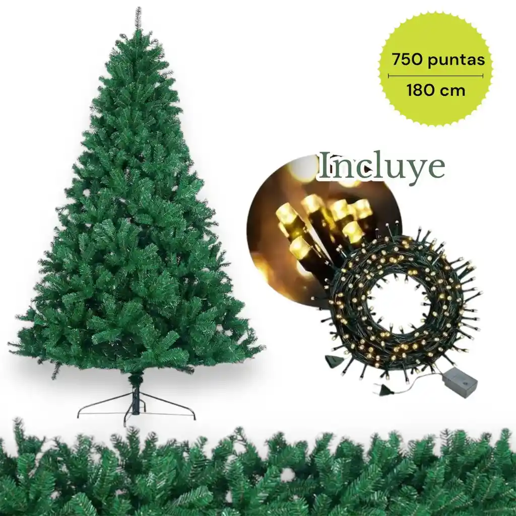 NUEVO ARBOL CLASICO FRONDOSO DE 180 CM DE ALTO FACIL DE ARMAR Y FACIL DE GUARDAR INCLUYE 1 EXTENSION DE LUCES DE 8M COLOR CALIDO CANTIDAD DE RAMAS 750 Árbol navideño de 1,80 metros de altura y 105 cm de ancho, ideal para decorar tu casa esta temporada. Árbol con follaje realista y frondoso, hecho con PET de alta calidad que asegura durabilidad y facilidad de limpieza, adecuado para interiores y exteriores. Base de metal con cuatro puntos de apoyo Fácil y rápido de armar, con ramas desplegables y flexibles que se adaptan a cualquier decoración. CARACTERÍSTICAS PRINCIPALES: -TAMAÑO - 1,8 m de altura y 105 cm de ancho, ideal para diversos espacios. -MATERIAL - PET ( PVC DE ALTA DENSIDAD) resistente y durable, fácil de limpiar. -SOPORTE - Base de metal con cuatro puntos de apoyo