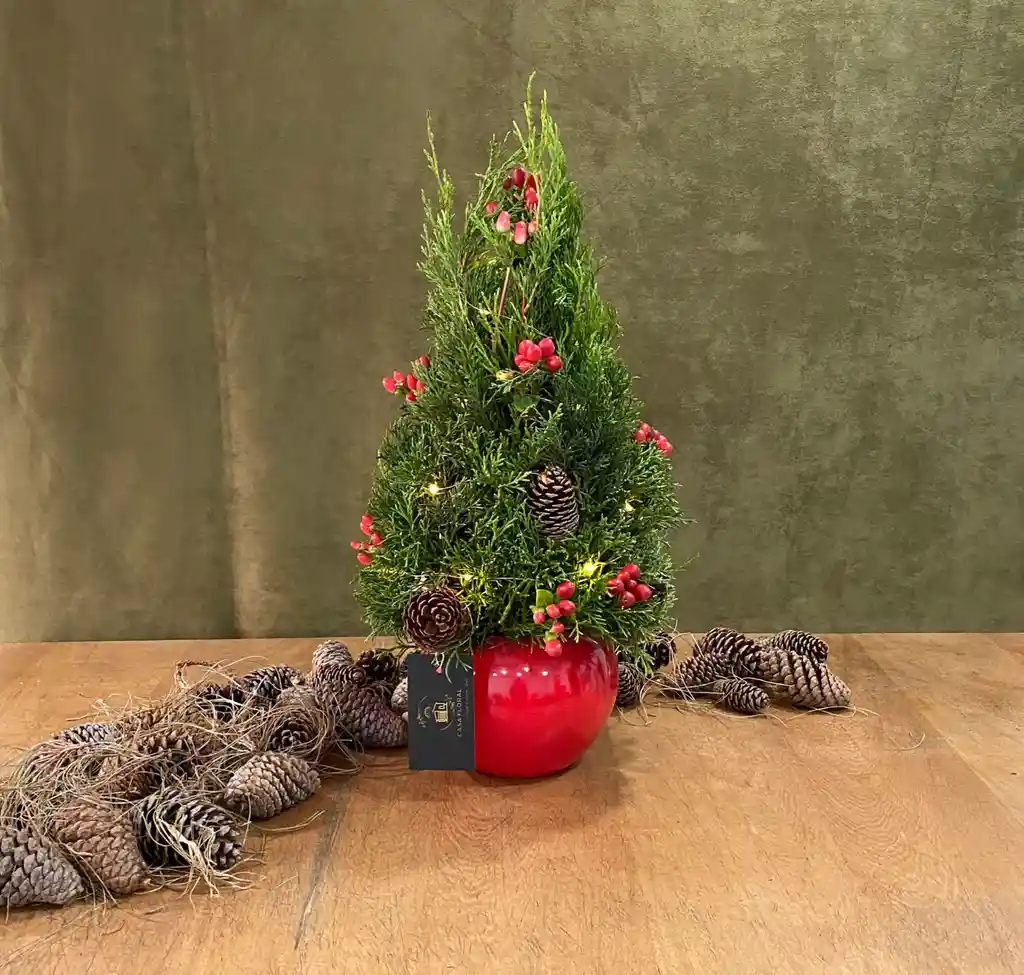 ARREGLO FRESCO DE PINO, EN FORMA DE PINO DE NAVIDAD INCLUYE BASE DE CERAMICA, LUCES LED, MEDIDAS APROXIMADAS 50 CMS DE ALTO POR 25 DE DIAMETRO, OTROS ELEMENTOS SON HYPERICUM, PIÑAS NAVIDEÑAS. IMÁGENES DE REFERENCIA