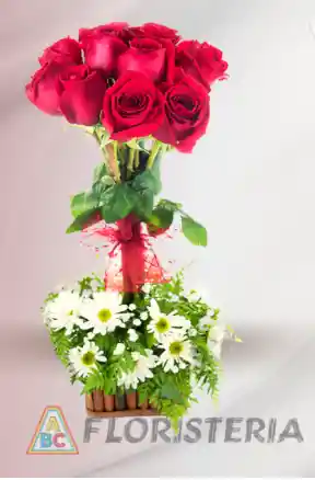 Flor de complemento ( Aster o Solidado). 12 Rosas rojas Follaje variado Oasis sencillo bloque 1 Tarjeta con mensaje personalizado 1 Base de madera mediana