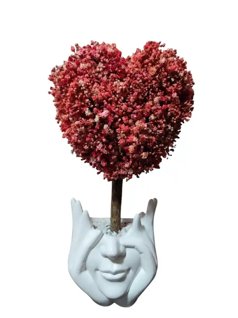 hermoso árbol eterno en forma de corazón con flores secas rojas con un aroma delicioso su matera es en cerámica terminada en resina su medida es de 29n cm de alto su duración es eterna