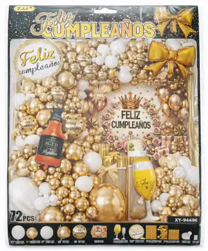 Decoración de cumpleaños con arco de globos en tonos Dorados y blanco. incluye globos impresos, figura de corona y detalles festivos. Perfecto para crear una celebración elegante y moderna en cualquier espacio.
