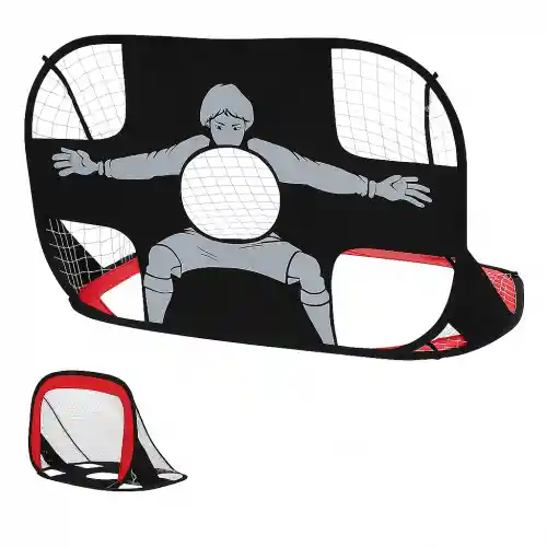 arco de fútbol infantil diseñado específicamente para el entrenamiento de precisión y puntería. Su característica principal es su diseño 2 en 1, que permite usarlo como una portería convencional o como un panel de práctica con objetivos definidos. Especificaciones Técnicas Dimensiones: 110 cm de ancho x 85 cm de alto (aunque algunos modelos similares pueden variar ligeramente a 120 x 80 x 80 cm). Materiales: Estructura: Fabricada comúnmente con varas de fibra de vidrio flexibles y ligeras. Tela: Confeccionado en tela Oxford de alta resistencia y duradera. Red: Malla de nailon o poliéster resistente al desgaste. Sistema de Montaje: Diseño "Pop-Up" (desplegable) que permite un armado rápido en segundos sin necesidad de herramientas. Portabilidad: Es totalmente plegable y suele incluir un bolso de transporte circular para facilitar su traslado a parques o jardines.