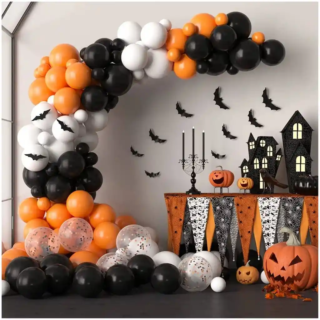 *********************GLOBOS Y PELUCHES MASMELO********************* Te damos toda la asesoria para que tú puedas armar tu propio arco. Por tu compra te llevas: 5 Globo transparente 30cm 30 Globo negro 30cm 30 Globo naranja 30cm 23 Globo blanco 30cm 10 Globo negro 13cm 10 Globo naranja 13cm 10 Globo blanco 13cm *Los globos se entregan desinflados, tu compra no incluye el montaje ni la decoración, el servicio de armado no lo tenemos disponible. sin embargo te damos todas las instrucciones para hacer de modo profesional. Si deseas adicionar otros articulos a tu compra puedes escribirnos, recuerda que Somos Globos y Peluches Masmelo ;) - En ciudades fuera de Bogotá despachamos para el mismo día si compras antes de las 11AM (no incluye festivos) - En Bogotá despachamos para el mismo día, si haces el pedido antes de las 4PM (no incluye festivos)
